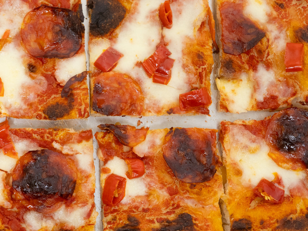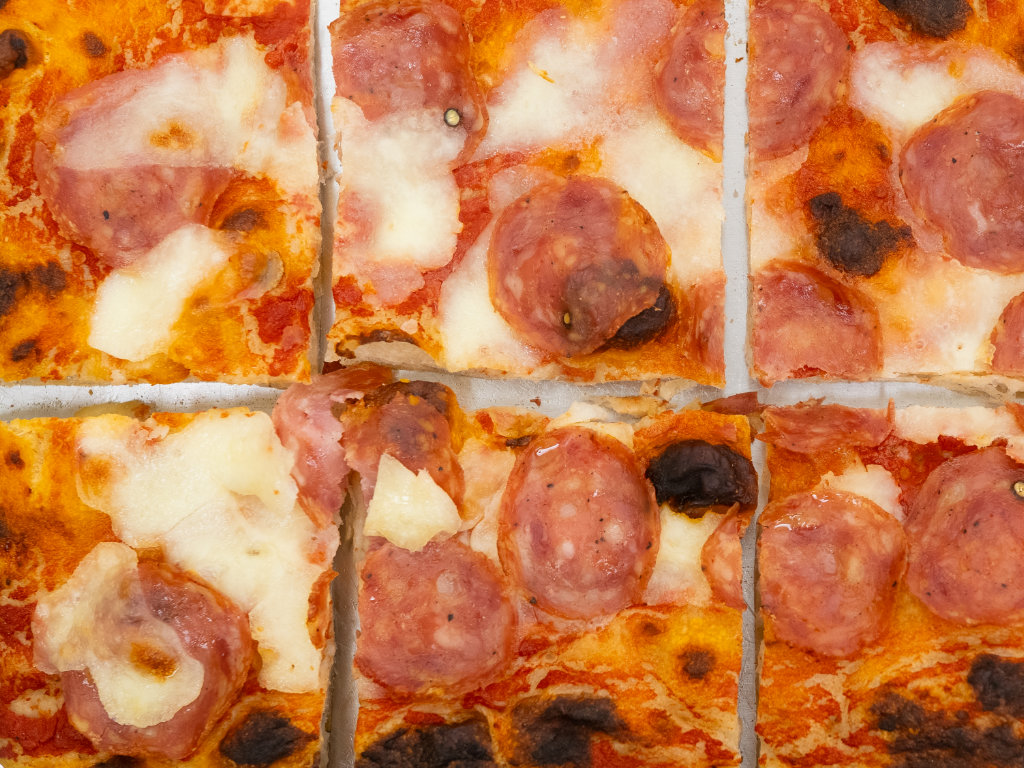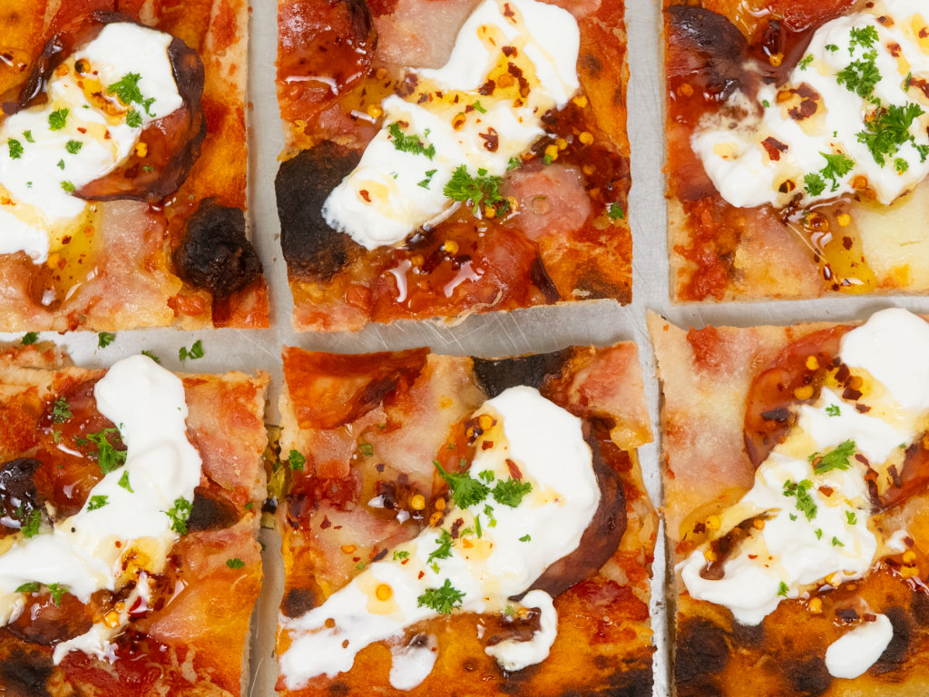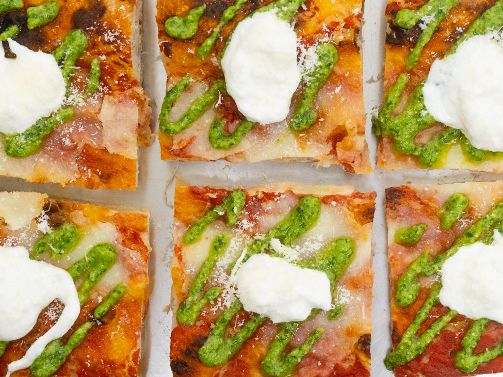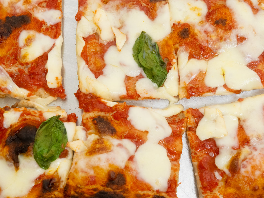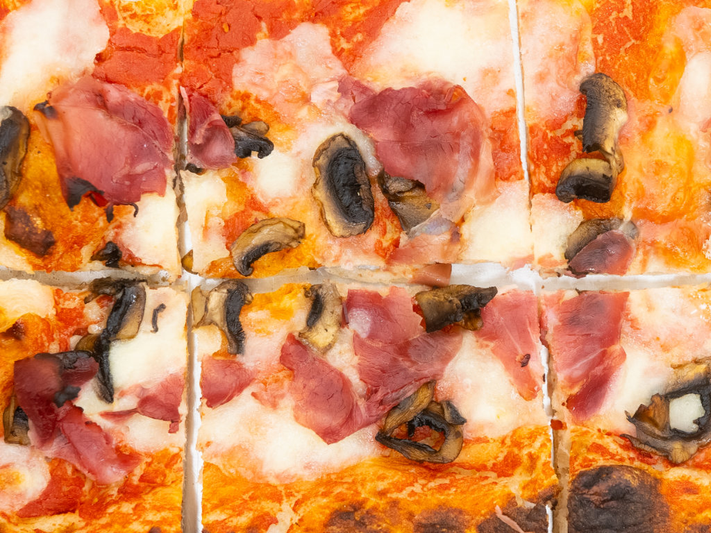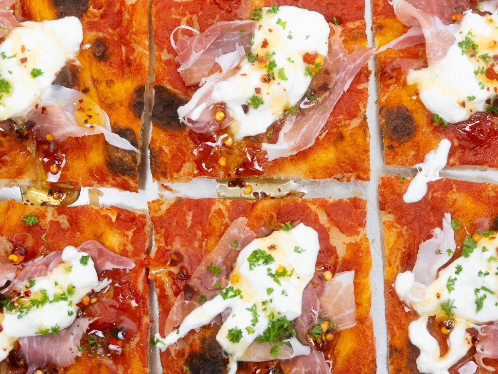 Original römische Pizza in teglia mit sehr hochwertigen Zutaten und einem Teig, der bis zu 72h ruht.