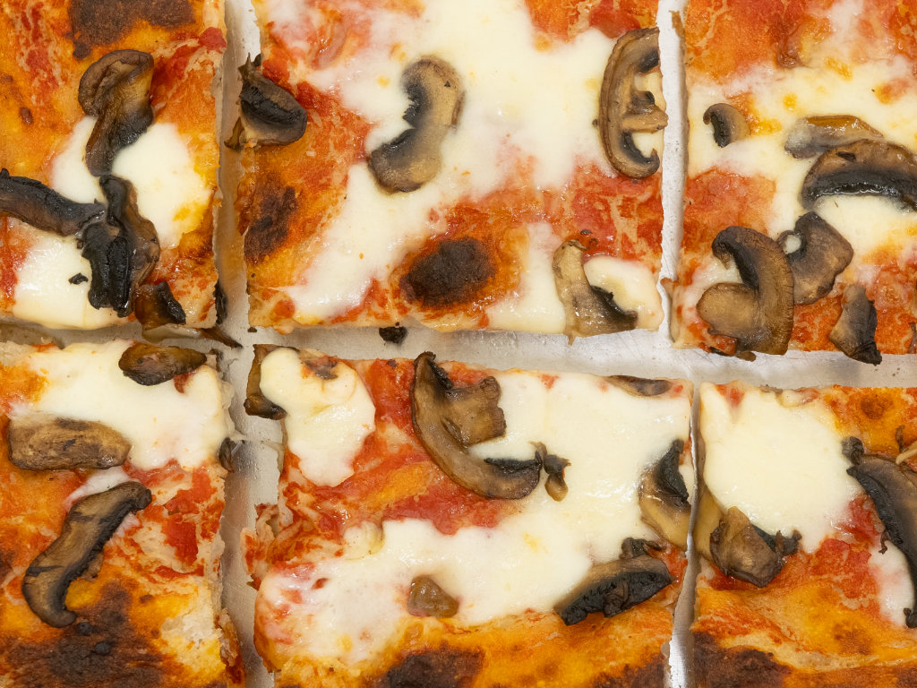 San Marzano Tomatensoße, Mozzarella Fior di Latte, gebratene Champignons